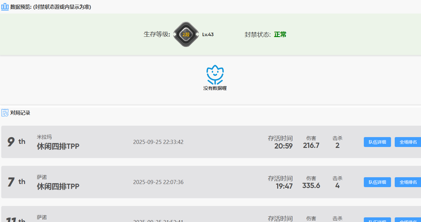 - 特点:界面美观,体验最佳:数据展示清晰直观,用户体验非常好。功能强大:提供赛季总览、单场详情、武器使用偏好、生存分析等深度数据。全队查询:在比赛记录中,可以一键查询该局所有队友和对手的战绩。
